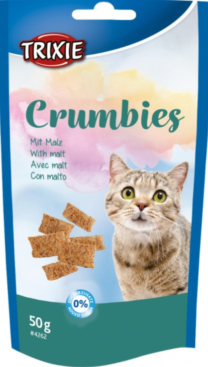 Trixie TX-4262 ласощі для кота Crumbies з солодом — хрусткі подушечки для котів із солодом сприяють природному виведенню шерсті з ШКТ. Гарантують гарне самопочуття кішки та регулюють обмін речовин